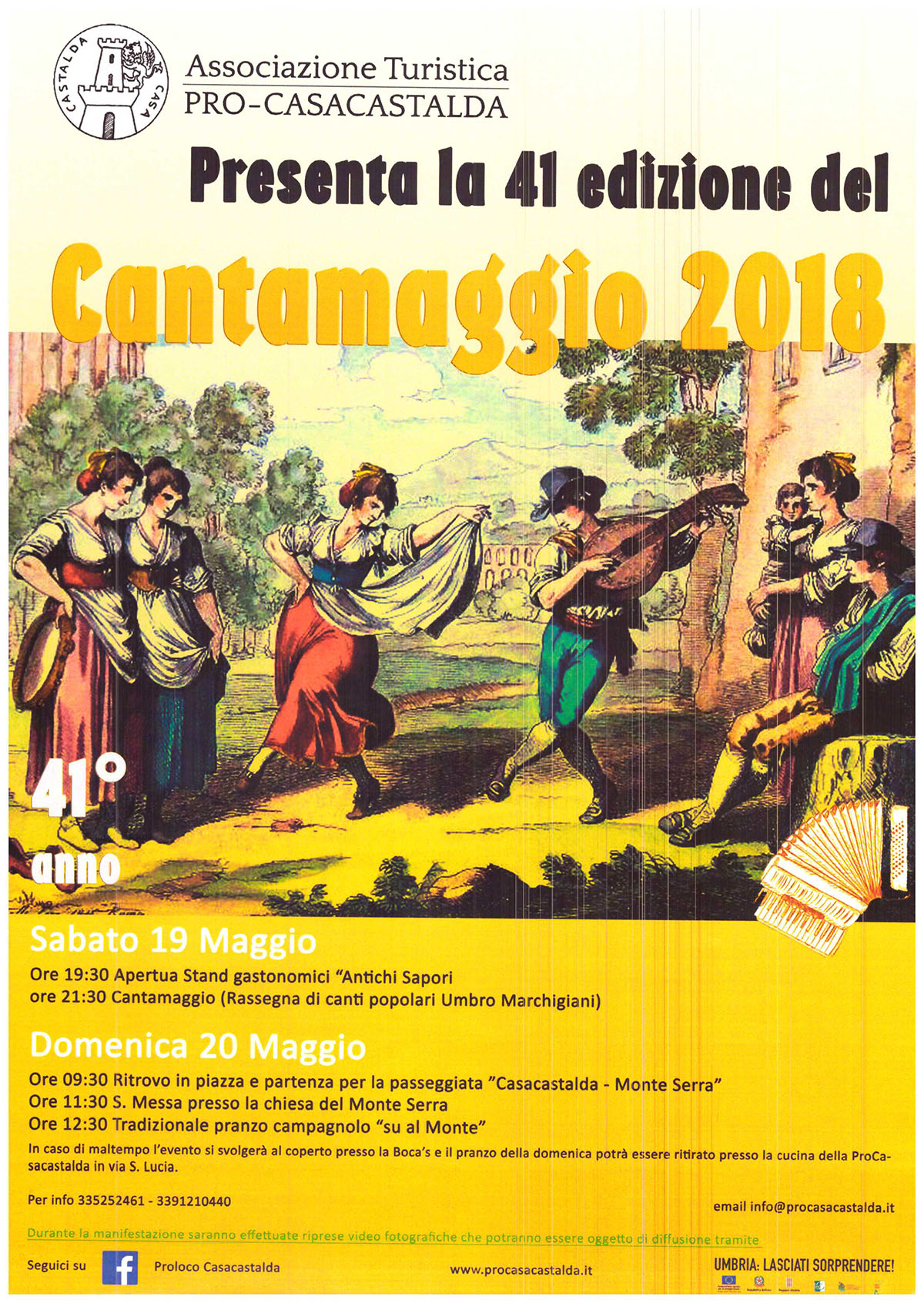 Nella serata del 19 Maggio si terrà la 41° edizione del “Cantamaggio”, manifestazione di folklore musicale e popolare alla quale parteciperanno gruppi caratteristici umbri e marchigiani presso la Piazza XXIV Maggio a Casa Castalda al fine di valorizzare il centro storico medievale del paese.